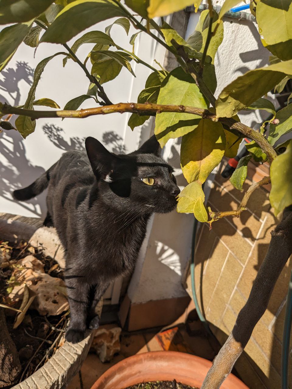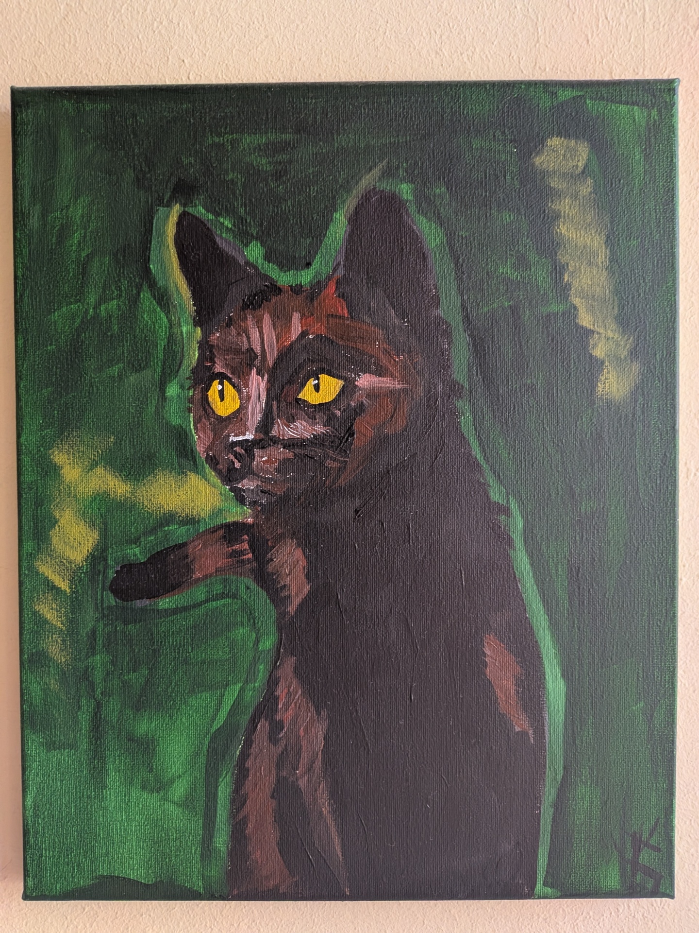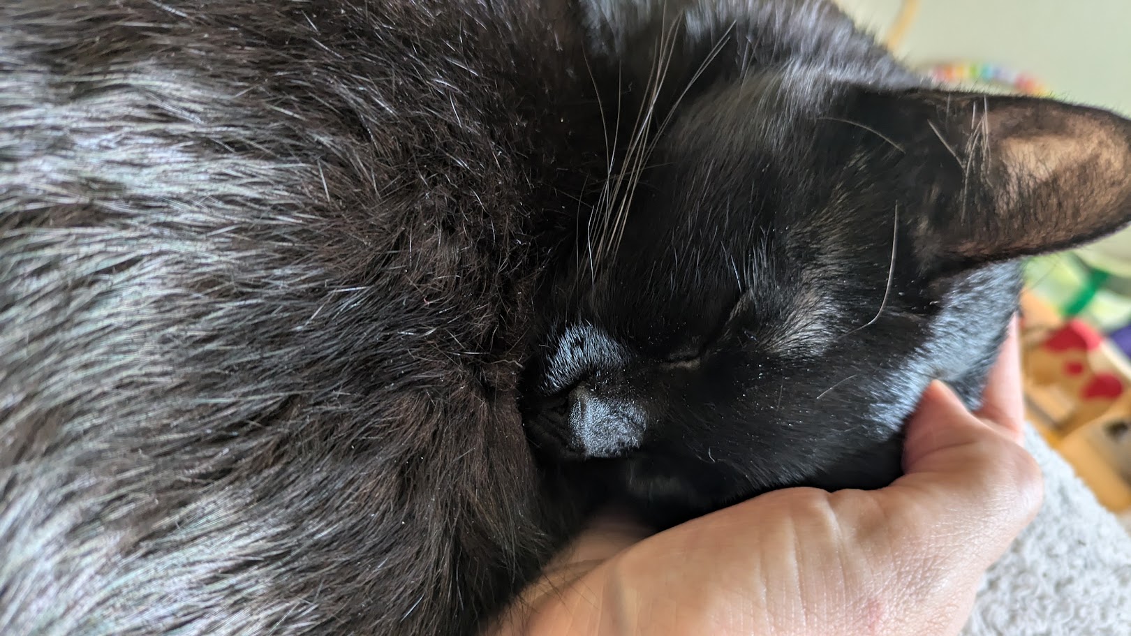Her full name is Thunder Flower. She is a black European short-hair cat with eyes that shift between deep amber and vivid green depending on her mood and the light. She was adopted in 2021 — one week earlier than officially recommended, because the people who had her insisted.
